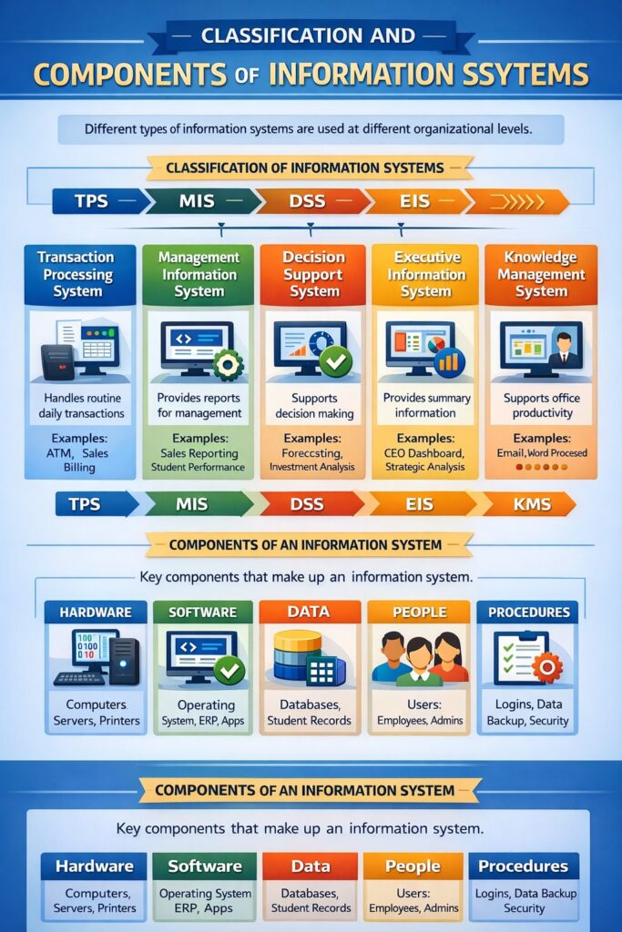 Information Systems are classified based on organizational needs and decision levels, while their components work together to transform data into useful information. Understanding both classification and components is essential for designing secure and legally compliant information systems.