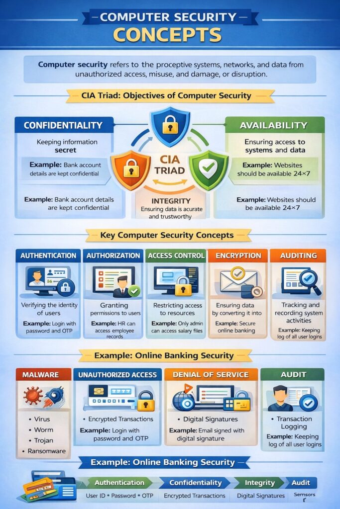 Computer security is essential to protect digital assets from growing cyber threats. Concepts like CIA triad, authentication, encryption, access control, and auditing form the backbone of secure systems. In today’s digital world, strong computer security is not only a technical requirement but also a legal and ethical necessity.