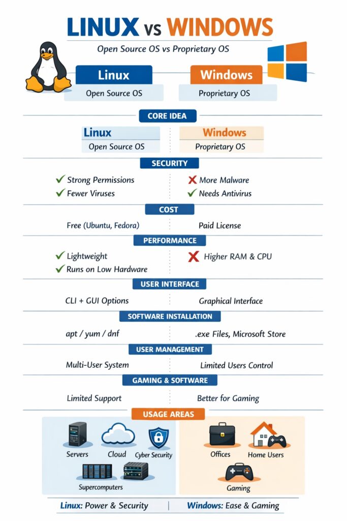 The following table explains the key differences between Linux and Windows operating systems in an exam-oriented and easy-to-understand manner.