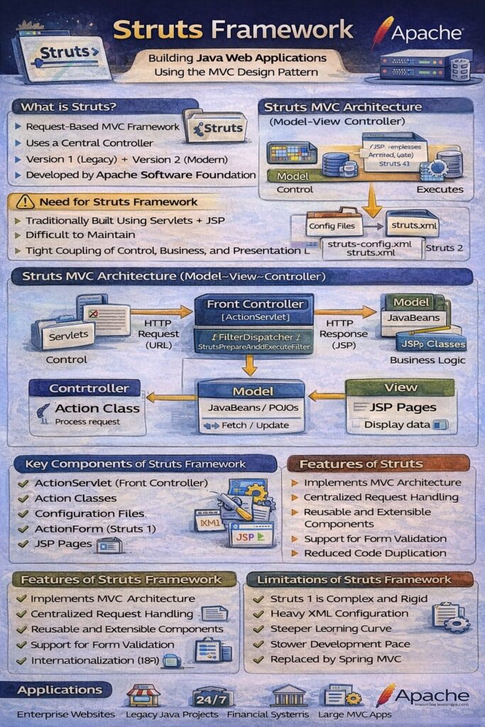 The Struts Framework is an open-source Java web application framework developed by the Apache Software Foundation. It is used to build scalable, maintainable, and structured web applications by implementing the Model–View–Controller (MVC) design pattern.