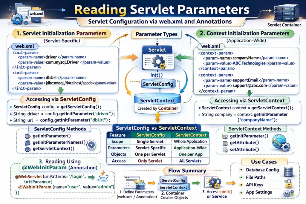 Reading servlet parameters is a fundamental mechanism for making servlets configurable and scalable. By using ServletConfig, a servlet can access its own initialization parameters, while ServletContext enables access to shared application-level parameters. Proper use of servlet parameters leads to cleaner code, better separation of configuration from logic, and easier maintenance of web applications.