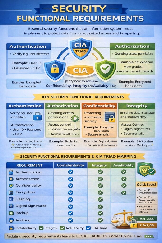 Security Functional Requirements are the operational backbone of information security. They translate abstract security goals into practical system controls such as authentication, authorization, encryption, auditing, and backup. A system that satisfies these requirements is more secure, reliable, and legally compliant.
