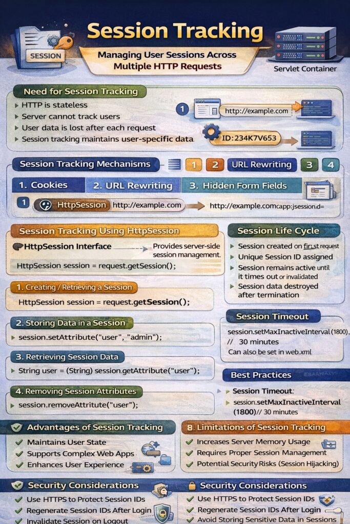 Session tracking is a fundamental concept in servlet-based web applications that enables the maintenance of user state across multiple requests. By using techniques such as cookies, URL rewriting, hidden fields, and especially the HttpSession interface, servlets can efficiently manage user interactions. Proper session management and security practices are crucial for building reliable and scalable web applications.