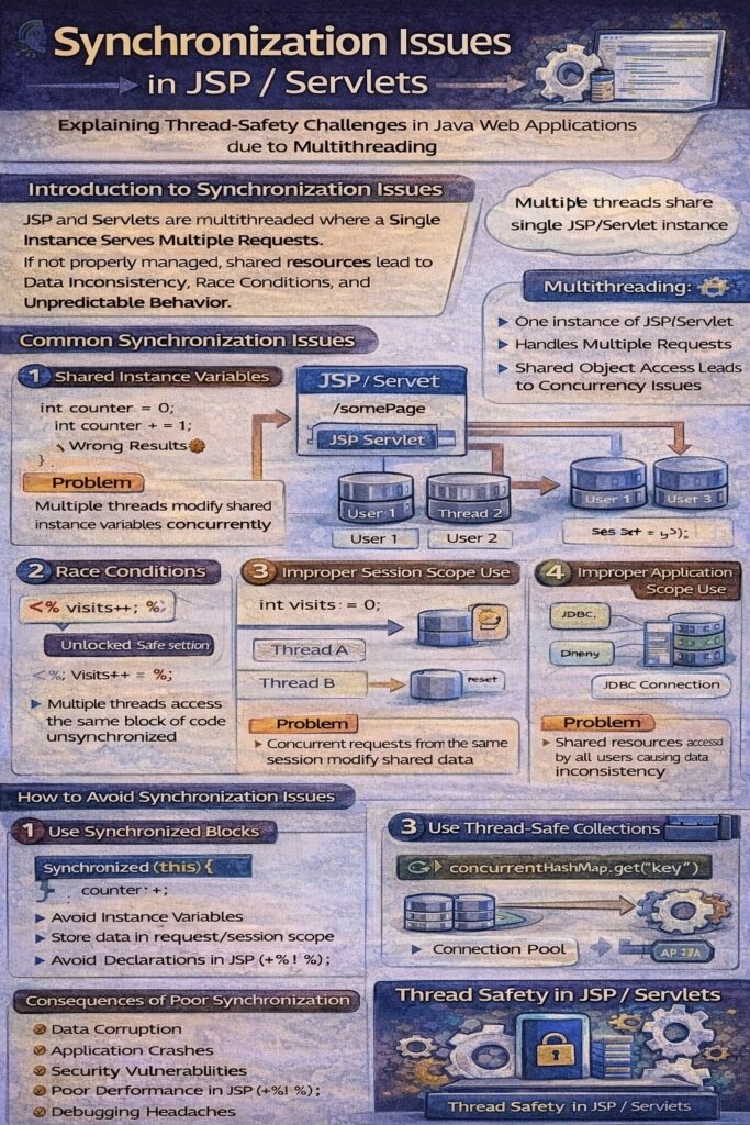 Synchronization issues in JSP and servlets arise due to the multithreaded execution model of web containers. Shared instance variables, improper scope usage, and unsynchronized access to resources can lead to serious data consistency and performance problems. By understanding thread behavior and applying proper synchronization techniques and best practices, developers can build efficient, scalable, and thread-safe Java web applications.